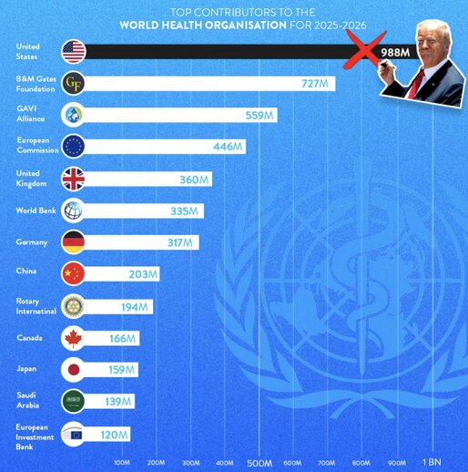 Die WHO - powered by Bill Gates™Das British Medical Journal (BMJ) hat’s endlich seziert: Zwischen 2000 und 2024 überwies die Bill & Melinda Gates Foundation sagenhafte 5,5 Milliarden Dollar an die WHO und zwar nicht als Spende, sondern als Steuerinstrument. Damit ist Gates der zweitgrösste Geldgeber der WHO, direkt hinter den USA, aber weit vor Deutschland, China oder der EU.